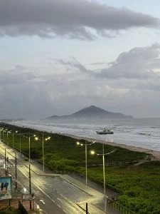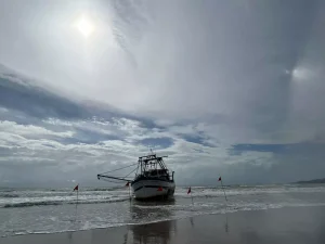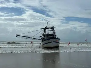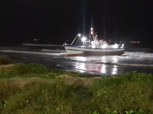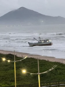 Barco encalhado na praia Central de Navegantes estava com 5 tripulantes que precisaram sair da embarcação a nado, aponta informações preliminares