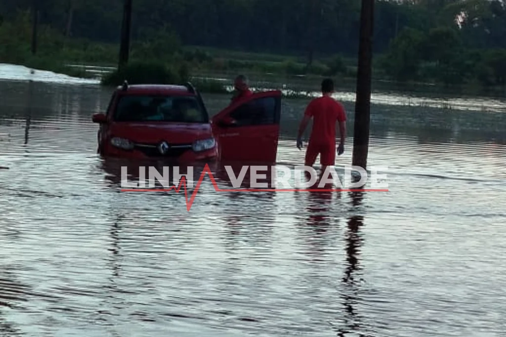 O chamado foi registrado por volta das 5h06, e a equipe de socorro deslocou-se até a Estrada Geral, onde constatou que o rio havia saído de seu leito, deixando parte da via coberta por cerca de meio metro de lâmina d’água. No centro da enxurrada, um carro permanecia imobilizado, com um ocupante em seu interior.