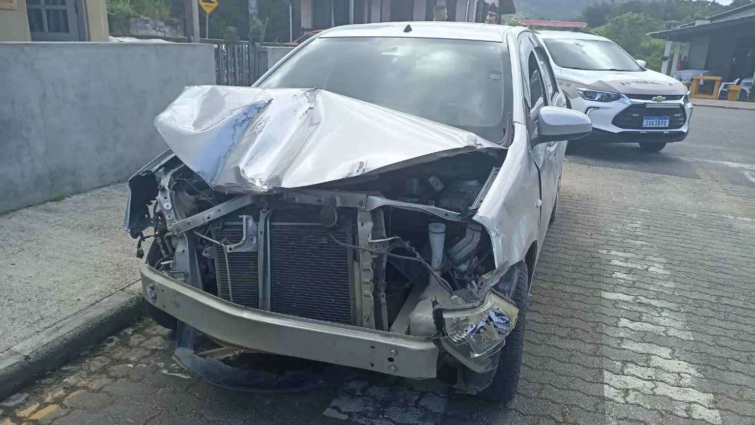 Após analisar as imagens das câmeras de segurança, a guarnição identificou o suspeito e seguiu até seu endereço. No local, encontraram o Etios bastante danificado em frente à residência. O homem saiu e conversou com os policiais, afirmando que acredita estar sendo perseguido por um indivíduo de Joinville, a quem teria denunciado por um crime que supostamente ocorreria em Orleans. Segundo ele, essa perseguição o levou a acelerar contra o portão do motel na tentativa de escapar do suposto agressor.