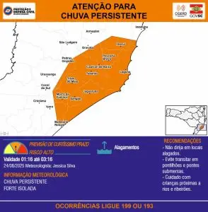 A Defesa Civil de Santa Catarina emitiu, na madrugada deste domingo (24), um alerta para chuva persistente de intensidade forte isolada no Litoral Sul, com possibilidade de alagamentos nas próximas horas. O aviso, publicado à 1h16, orienta a população a ligar para os números 199 (Defesa Civil) ou 193 (Corpo de Bombeiros) em caso de ocorrências.