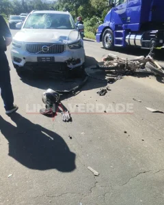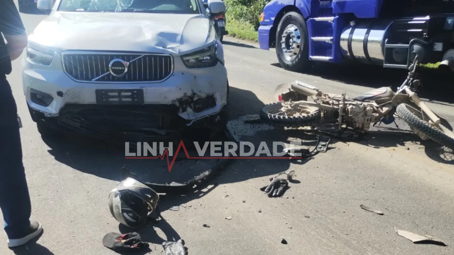 Um grave acidente de trânsito foi registrado na tarde deste domingo (31), por volta das 14h, na Rodovia José Spillere, no Caravaggio, em Nova Veneza. A colisão envolveu uma motocicleta Yamaha XT e um SUV Volvo, resultando em ferimentos graves ao condutor da moto, um homem adulto cuja identidade ainda não foi divulgada.
