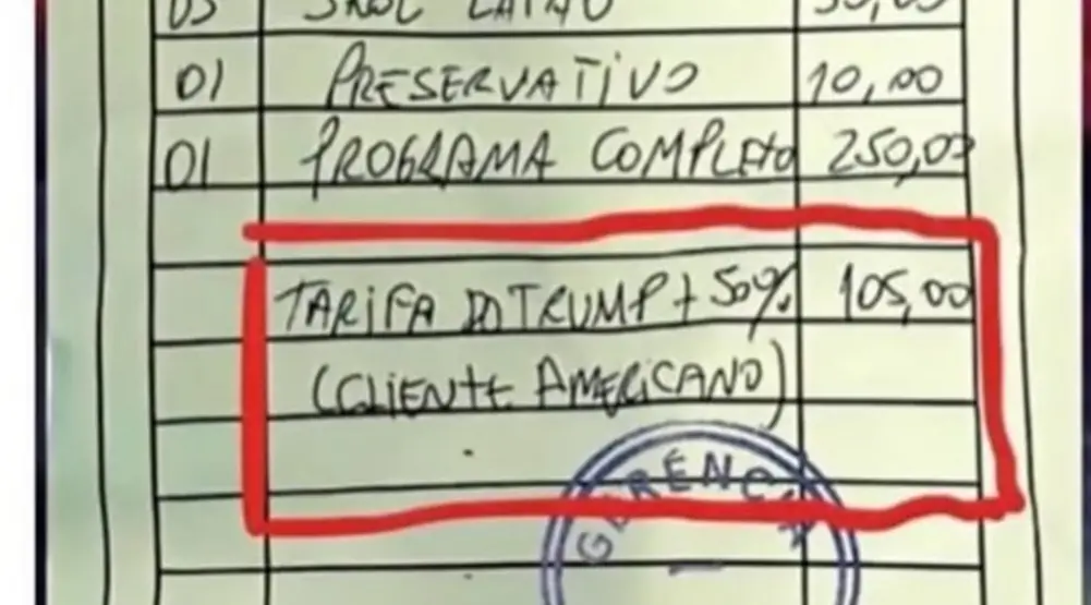 Suposto recibo de um cabaré, que seria localizado em Fortaleza (CE), viralizou nas redes sociais nessa sexta-feira (11/7). O papel apresenta a conta de consumo do estabelecimento, com produtos e serviços, mas chamou a atenção por um detalhe inusitado: o valor total foi acrescido em 50%, como “tarifa do Trump”, porque o cliente seria norte-americano.