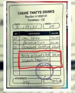 A conta do estabelecimento de prostituição somou R$ 310, inicialmente. Com a cobrança da “tarifa do Trump”, o total passou a ser de R$ 415, o que não corresponde ao suposto acréscimo de 50%, já que o valor final correto deveria ser de R$ 465.