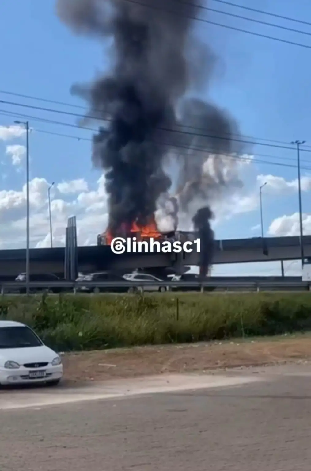 O motorista de um caminhão carregado com ração morreu após o veículo explodir e pegar fogo na tarde desta terça-feira 02/12/25, na alça de acesso da BR-448 para a Freeway, no sentido interior–Capital, em Porto Alegre.