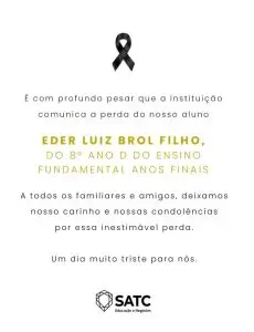 Eder era estudante do 8º ano do Ensino Fundamental da Satc, a instituição emitiu uma nota de pesar lamentando a perda irreparável do aluno, confira.
